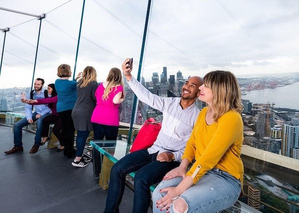 The latest addition is the Skyriser open-air benches attached to the transparent surface. Seated on this inventive bench, capture a photo that skillfully creates the illusion of floating 520 feet above the mesmerizing Seattle skyline.